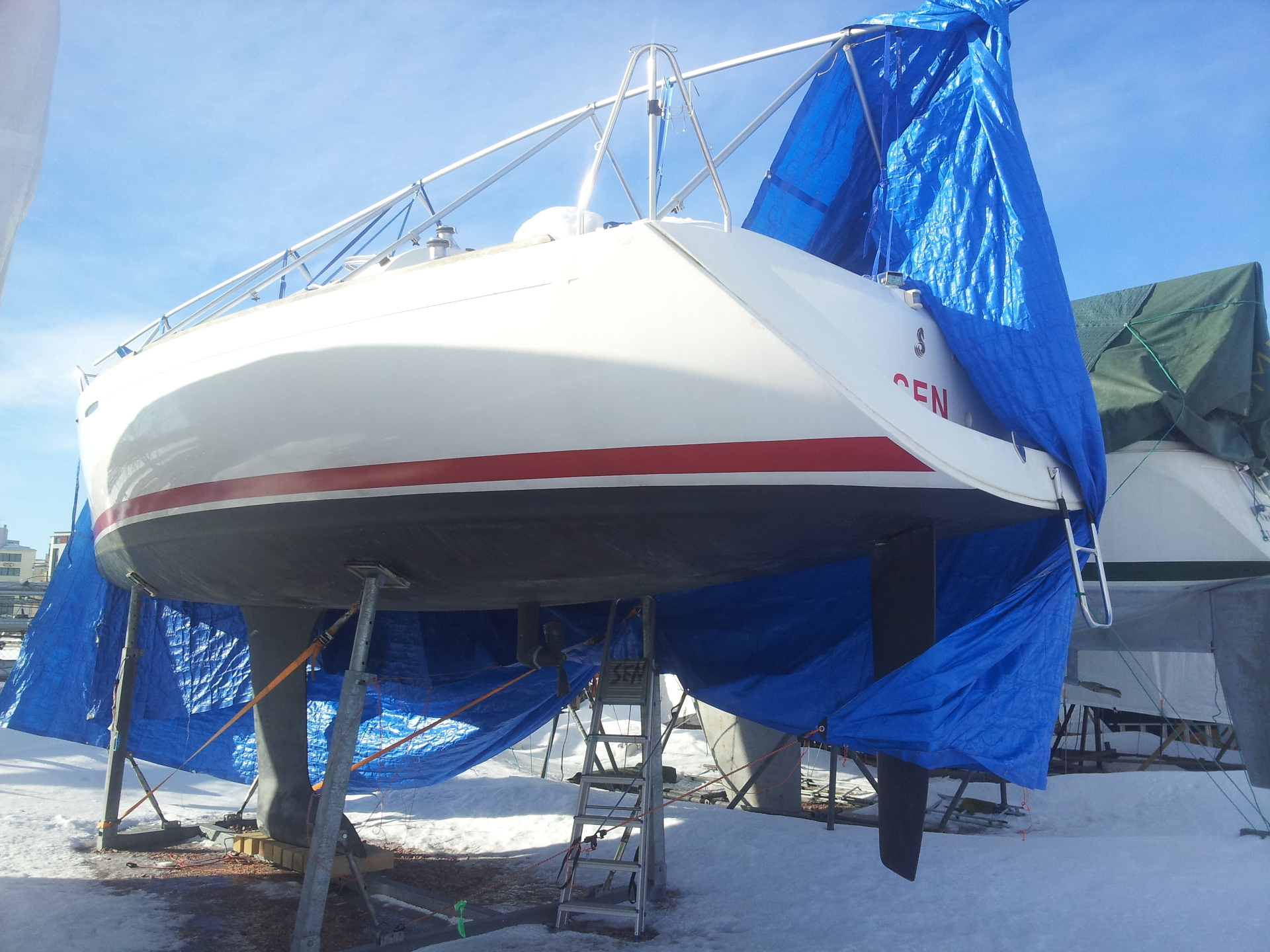 Kevät on hiukan hankalaa aikaa pressuttomalle veneelle. Päivisin on plussaa ja öisin reilusti pakkasta. Eli lumi ja jää vuorotellen sulavat ja jäätyvät. Ei hyvä.
