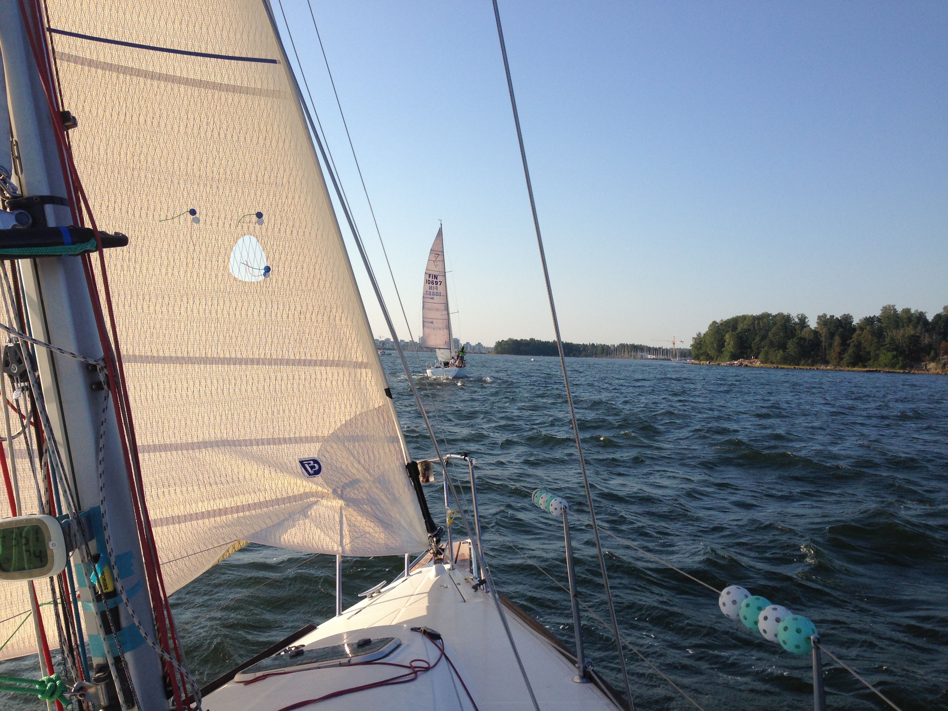 Lauantain kehnosti menneistä, joskin silti ihan semilupaavista, starteista sisuuntuneena lähdettiin ekaan lähtöön hakemaan ainakin yhtä viron päänahkaa. Homma sujuikin hienosti alkuunsa. Ylämerkillä kärjen tuntumassa ja alas tultiinkin jo niukasti kärjessä. Päätettiin ottaa vasen reuna, jossa isot näytti vetävän ihan hyvin omassa tokassa ylämäessään, ja näin pakottaa seuraajat joko seuraan tai valkkaan paskempi reuna. Se ”paskempi reuna” saikin sitten 30 astetta tuulta osakseen ja melkein törmäsivät leikkariin meidän olessa etäällä toisessa reunassa. Ei auttanut muuta kuin nöyrästi byyriin hakeen jälleen reipas sijanumero.