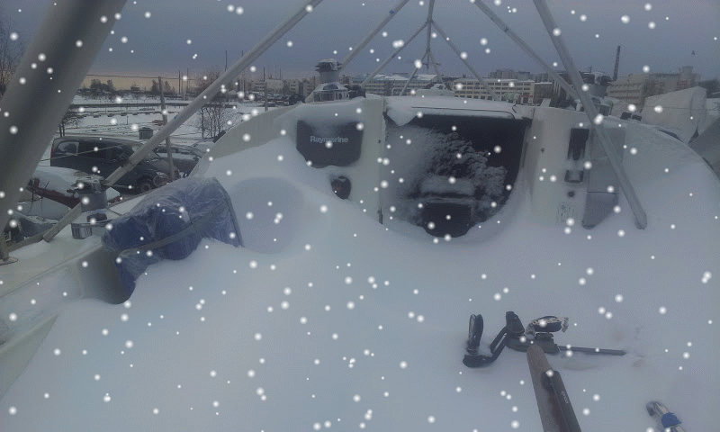 Helmikuu alkoi, lumi vettyi loskaksi ja kesä on kulman takana. Varustamo on löysäillessään murehtinut varusteita ja muuta tilpehööriä jättäen itse kajakin oman pukkinsa nojaan. Näyttää vahvasti siltä että tästä tulee ensimmäinen talvi, josta pressu selviää hyvässä kunnossa. Lisäksi on ollut ilo seurata miten pelkkä kalanruoto pitää moskan poissa kannelta. Melkein tammikuun loppuun päästiin mukavasti kunnes lorahti. Lumiharjalla ja -lapiolla meni vajaa vartti joten se siitä.