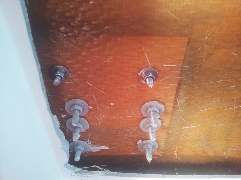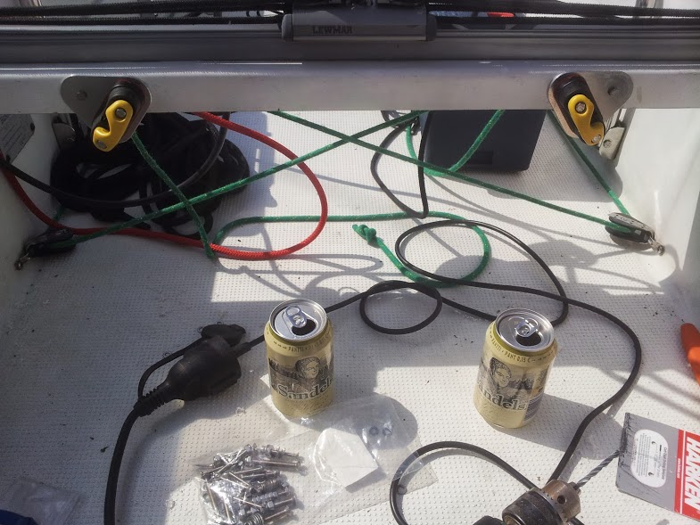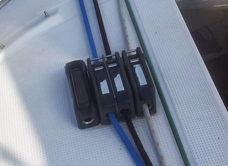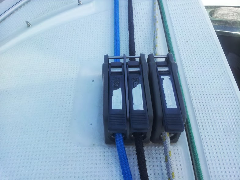 Tuo sininen on keulan skuuttipisteen uusi säätörapu, mutta M5 50mm ei rittänyt alkuunsa, 60mm on hilkuilla. Se on vierailtava jossain alan kaupassa, kenties Helsingin Pultti tms voisi auttaa. Pulteista on otettava muistiin, että tuo Harkenin cam cleat ottaa paljaaltaan M5 uppokannan, mutta tuon päälle läiskäistävän fairleadin kanssa tasakannan. 50mm riitti hyvin tuohon seuraavaan, eli ison skuutin lisäpuolituksen ravut.