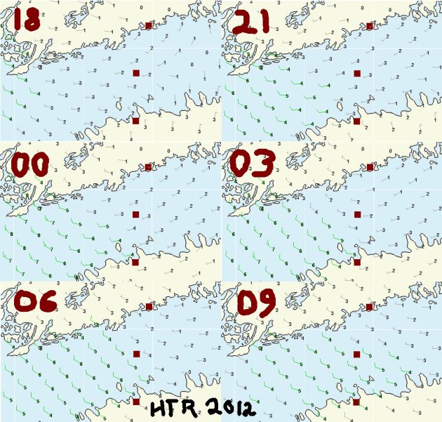 Jälkikäteen ajateltuna tohon pitää silti olla ihan semityytyväinen. Miehistön ja kipparin kokemus huomoiden suoriuduimme koko yöstä ihan hyvin. Monta asiaa meni ihan hyvin, eikä virheitä tehty mitenkään roppakaupalla. Vauhdinkaan kanssa ei tuntunut olevan pahempia ongelmia. Vain perinteinen G1 sivusella tuntui heikolta. Otsikosta huolimatta turha tässä Länttä tai säätä on syytellä. Kyllä se perseily taas tuli ihan omasta alotteesta. Nyt uudestaan katsoen tarkemmin tuulikuvia niin vedimme jo niillä tiedoilla selvästi yli. Kello oli enemmän kuin miltä sillon tuntui. Ja kuvan 03:00:n tuuli oli ennusteissakin lännempi kuin mitä muistelin yöllä sitä shiftiä odotellessa. Ei olisi haitaksi jos tuota kuvien väijymisen taakkaa saisi vähän jaettua. Ja vielä vähemmän olisi haitaksi jos itsekin vaivautuisi niitä katsomaan eikä vaan printtaileen, koska reissun mittaan viriää aina uusia kysymyksiä joita ei vielä maissa ennen lähtöä tule mieleen. Ei nimittäin ollut eka kerta kun niihin olisi ollut ihan oikeat vastaukset papereissa mukana, mutta touhussa ja tohinassa jäivät taas katsomatta. Mieliin tulee useampikin vssr ja etenkin 2010 HTR, jossa muistimme shiftin väärinpäin ja teimme kädenkäänteessä mittavaa tuhoa muuten varsin hyvin meneelle kisalle. Noh, sentään oli taktiikka, eikä se edes ollut ihan väärä ja siitä pidettiin kiinni. Toteutus ja tarkkuus vielä jättivät kyllä toivomisen varaa.